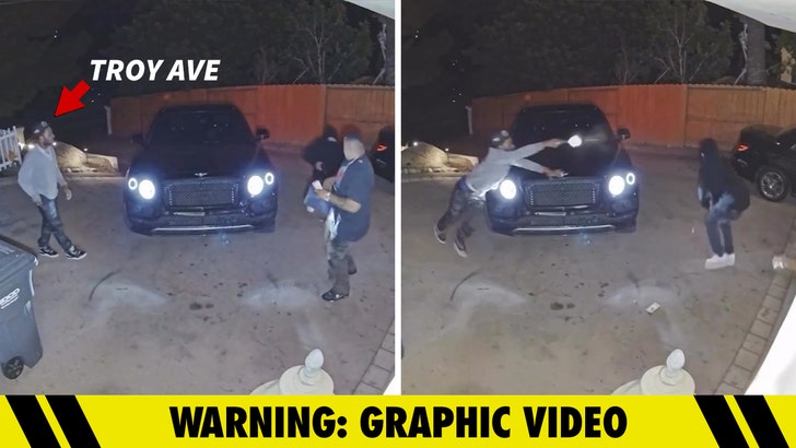 The shootout went down within the San Diego space — dwelling safety footage reveals Geoff pull up at dwelling in his Bentley, Troy will get out on the passenger aspect … and as each males are strolling towards the storage, a would-be robber sneaks down the alley and fees at Geoff.